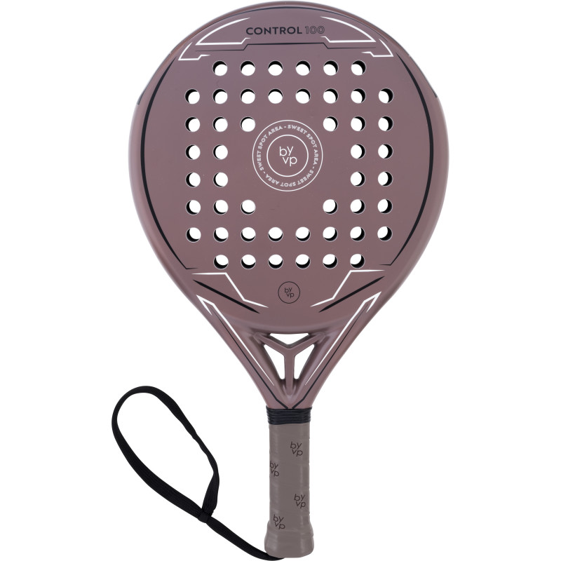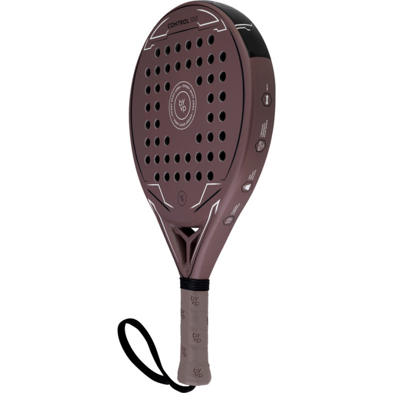 Introducing the "By-VP Padel Racket Control 100" – a sophisticated and high-performance padel racket designed for players who value precision and control. This round-shaped racket boasts an elegant brown colour with striking black accents, creating a sleek and professional look.