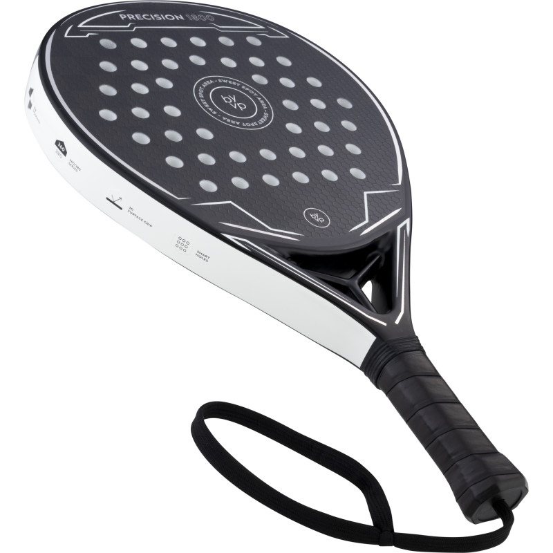 Introducing the By-VP Padel Racket Drop Precision 1800, a teardrop-shaped padel racket that marries a sleek black design with striking white accents. Crafted with a carbon frame and a fiberglass core, this racket embodies the perfect balance of strength and flexibility.